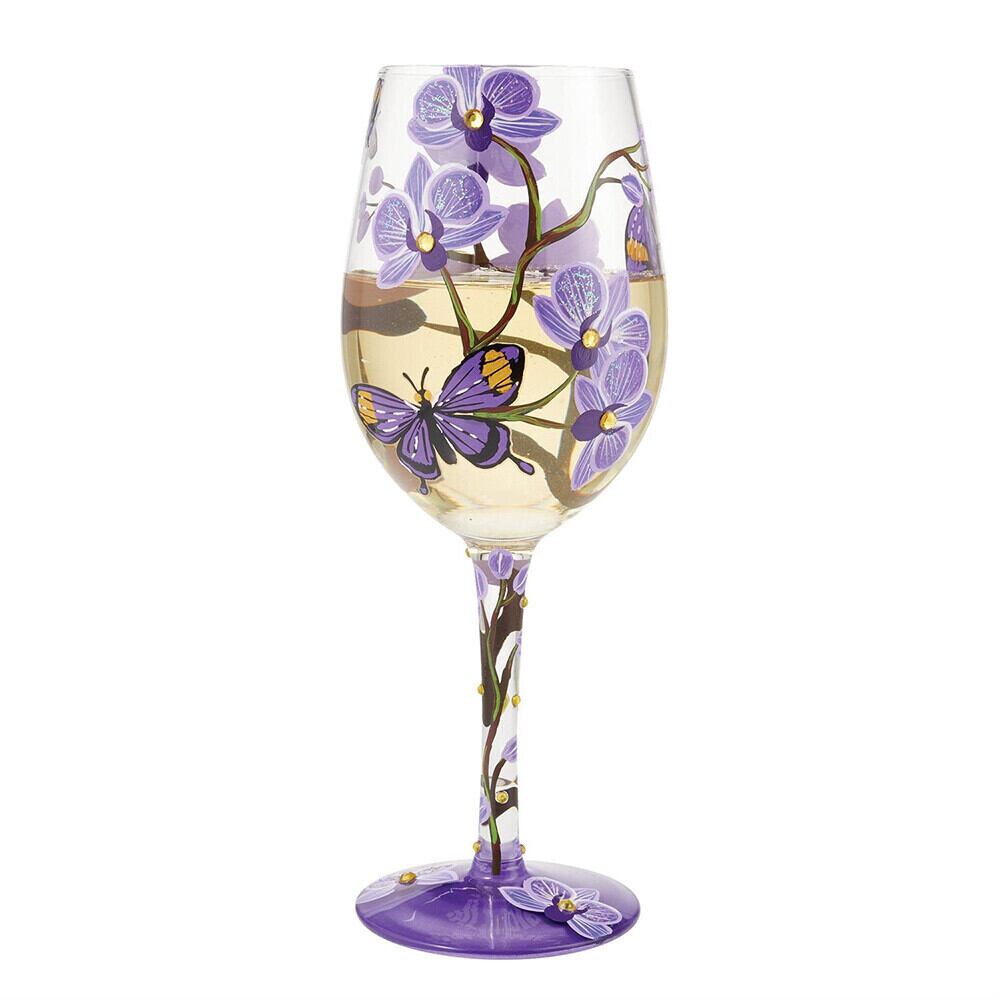 絵画のように美しい紫色の風景が印象的なワイングラスです。